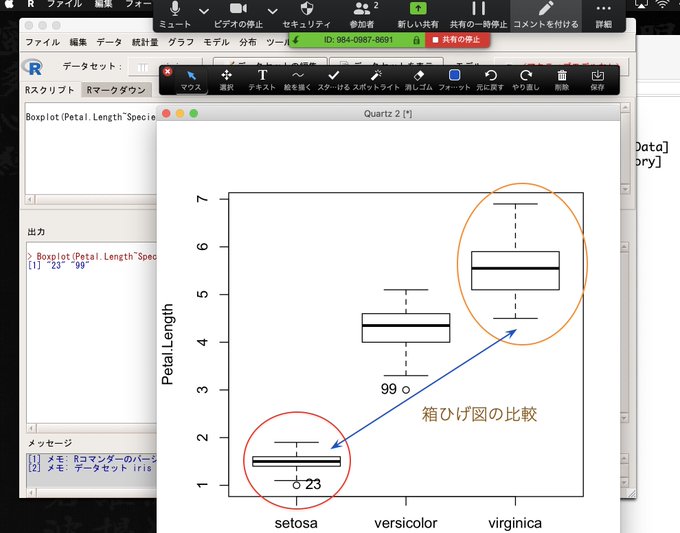 ◆Zoom 操作メモ:macOS のユニバーサル画面拡大はオーディエンス側では反映されない.Parallels Desktop の Windows では ZoomIt アプリによる画面拡大とペン書きはオーディエンス側にも正しく反映される.したがって,R 実習時のスクリプト拡大作業は Win の方が便利みたい.もちろん macOS の「共有画面」でも R のフォントサイズをそのつど変更すれば可読性はよくなるんだけどね.