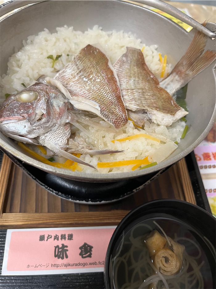 ◆涼しい夕暮れ時。道後温泉にさっさと戻って、いつもの〈味倉〉にて瀬戸内風の鯛のあら飯を平らげたのち、デザートをいただいて帰宅。