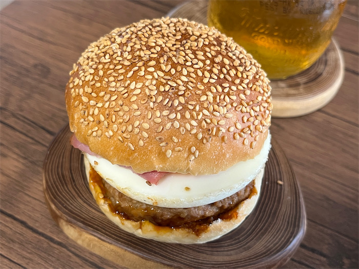 ◆〈ユノマチベーカリー〉にて朝ご飯の調達。とても挑戦的な分厚さの「お月見バーガー」をゲット。パテ+目玉焼き+ベーコンの三段重ね。これひとつでもう十分でございます。
