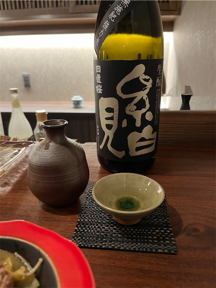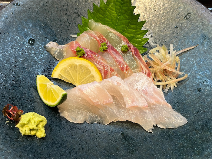 続いて、愛南のウメイロのお造り(前方)とイサキの漬け(後方)。大洲の〈叶川〉特別純米・生とともに。初めていただくウメイロは南方系の魚とのこと。愛媛でも南予でしか水揚げされないらしい。
