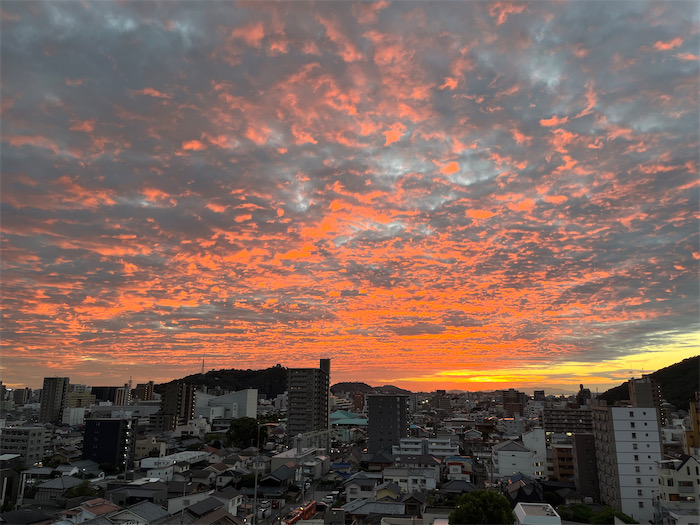 ◆最高気温34.1度の暑さは日が暮れてもそのまま淀んでいる。夕暮れ時、松山の空を染める夕焼けは海の方までずっと広がっていた。昨日はお月見、今日は夕焼け。
