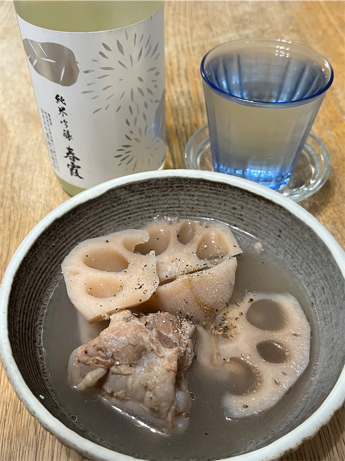 ◆ひさしぶりの〈みなか食堂〉営業中。今宵は地元の蓮根と豚軟骨のスープ。レシピはスペアリブの「蓮藕排骨湯」とほぼ同じ。味付けは岩塩のみ。つくったその日よりは翌日の方がきっとおいしくなっている。秋田の〈春霞〉純米吟醸・栗ラベル白・酒こまち生とともに。