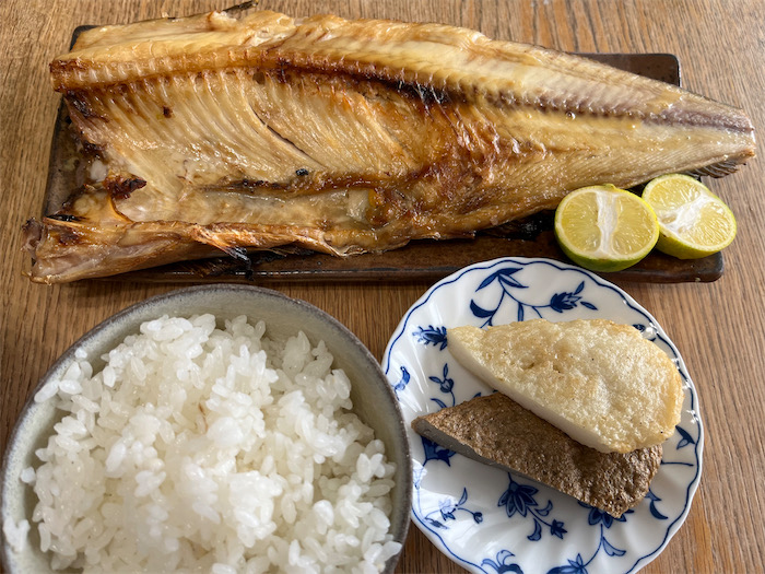 ◆稚内直送のホッケのひらきが巨大すぎて、そのままではガスレンジのグリルにとうてい入らない。一枚を半分にし、さらにアタマと尾を落としてやっと入った。脂がたっぷり乗っているので、すだちをたっぷり絞っていただきました。朝からごちそうさま。