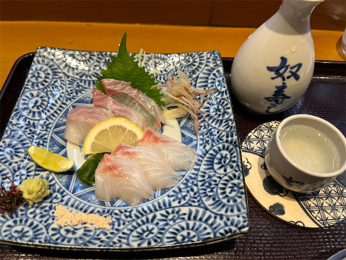 ◆今宵は〈奴寿し〉にてオジサンとグレ(メジナ)を「京ひな」輝乃吟のぬる燗とともに。