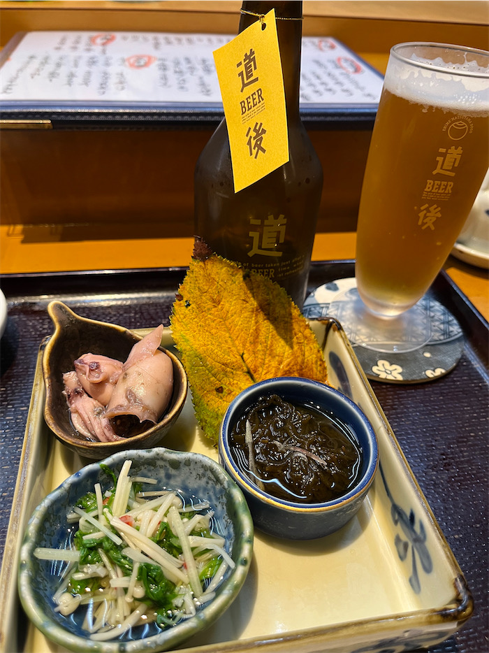 ◆道後に着いたらまずは〈奴寿し〉にて夜の吸水を。つきだしも秋らしく。