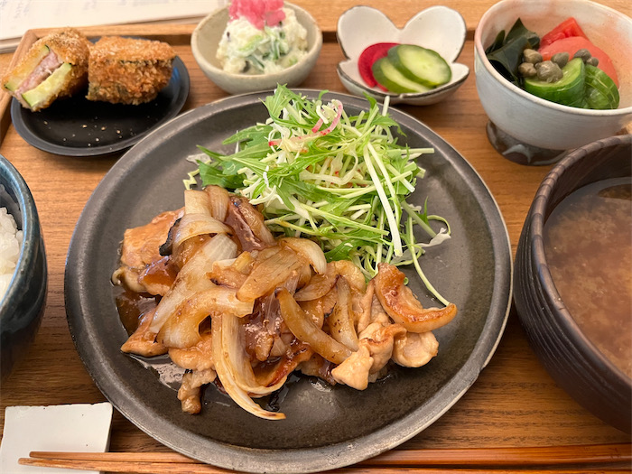 ◆真夏日の昼下がりは流星台の〈だだ食堂〉へ。ひさしぶり。ささやかな生姜焼きランチ。どの小鉢も美味しい。