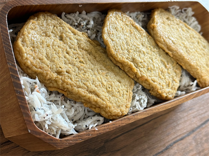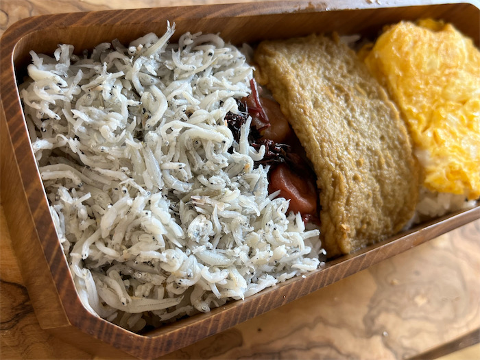 ◆〈みなか食堂・道後店〉本日のお弁当は「釜揚げしらすごはん」。何のことはない、白ごはんの上に釜揚げしらすをてんこ盛りにトッピングしただけというごまかしの効かないお弁当。道後店をオープンしてから、愛媛の釜揚げしらすの美味さを心底実感している。しらす干しやちりめんじゃことはちがって、水気の多い釜揚げしらすは日持ちがしないので、買ったらすぐに使い切るようにしている。さあどうぞ!
