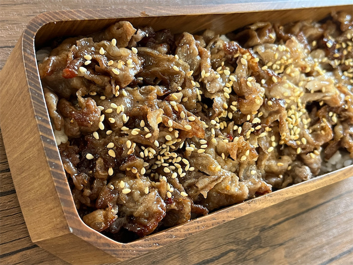 ◆昼下がりの気温は31.0度と真夏日ラインを超えた。〈みなか食堂・道後店〉今日のお弁当は逃げも隠れもしない「焼肉弁当」。ここのところ “真っ白い弁当” だったり “真っ黄色の弁当” だったり、たまに、じゃこ天を敷き詰めたら「しらすの上にトーストが乗ってる!」とか誤解されたりしてきたが、今日は誰にも文句を言わせない国産和牛切り落としの説得力。どうだ!