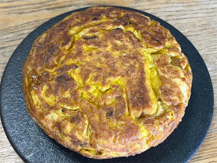 ◆〈みなか食堂・つくば本店〉土曜の朝メニューはスペイン風オムレツ。卵と新ジャガと新玉ねぎがたくさんあればこれをつくるしかない。卵は6個、新ジャガ3個と新玉ねぎ1個が基本。これで厚さ5cmほどに焼き上がる。