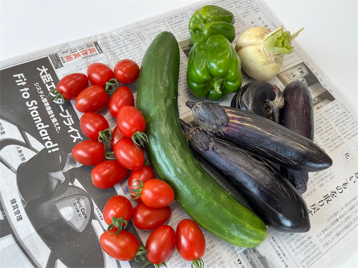 ◆炎天下の午前中も学生たちは「農業基礎演習 I」で圃場作業に励んでいた。梅雨が明けて夏野菜がどんどん育ち、収穫のハイシーズン到来。余った野菜を脇からちょいといただいた。これだけあればラタトゥイユひと鍋分の食材になるだろう。