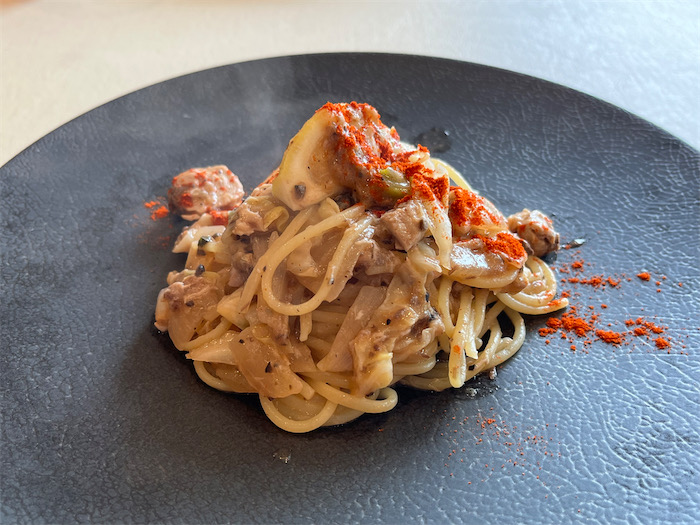 ◆〈みなか食堂・つくば本店〉夜のメニューは「桃と生ハムの冷製パスタ」。昼に続いてまたパスタか( “長いもん” が好きな店主)。茹でたカペッリーニを氷水でしめてひんやりと。生ハムはみなかみ町の精肉店〈育風堂〉の「はもんみなかみ」を使いました。