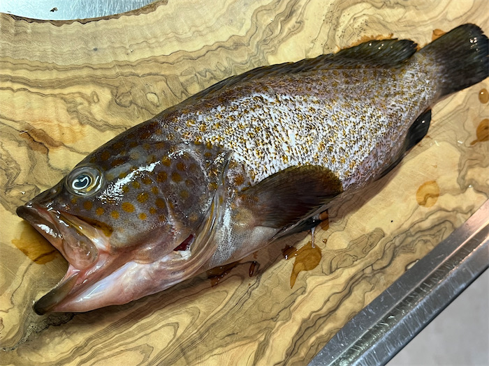 ◆蒸し暑さが淀む夕方、帰りしなに業務スーパーに寄ったら、アコウ(=キジハタ)がにらみつけてきた。30cm台サイズが450円とこのスーパーでは “高級魚” なお値段だったが、せっかくの機会なので連れ帰ってきた。