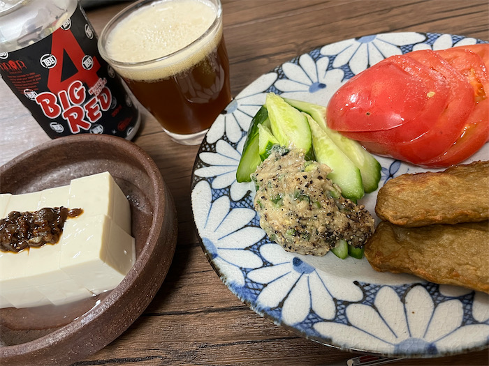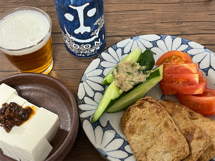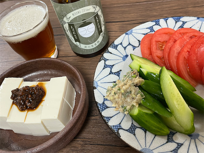 ◆今宵の夕餉は、いただきものの久万高原町「美川茶麦酒」のアテとして、葱味噌を添えたキュウリ、岩塩を振ったトマト、そしていまも熟成中の醤をトッピングした冷奴を用意した。美川茶麦酒は番茶のような色で、確かにお茶の風味がした。