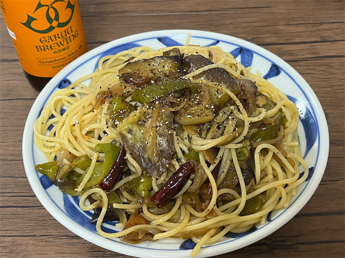 ◆せっかく新鮮な食材があるので、今宵の〈みなか食堂・道後店〉の夜メニューは「茄子とピーマンのパスタ」:【食材】茄子(大1個)・ピーマン(2個)・玉ねぎ(1/2個)・EVオリーブオイル(大さじ2)・にんにく(2片)・鷹の爪(2本)・スパゲティ1.7mm(140g)【調味料】海塩(大さじ1)・黒胡椒(適量)。