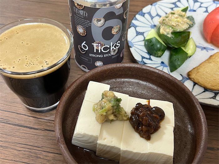 千舟町〈DD4D Brewing〉の Strong Stout「6 Ticks」を抜栓。アルコール度数9%の黒ビールはそうとうアブナイ。