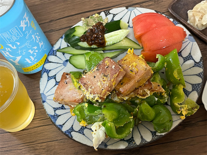 ◆今日の最高気温は35.9度。夜7時になっても真夏日のまま。この暑さに立ち向かうには “塩分” が必須だ。今宵の〈みなか食堂・道後店〉では、〈ヤッホー・ブルーイング〉の 「セッション柚子エール〜あら塩仕立て〜」を中心に、大学の圃場で収穫されたピーマンとランチョンミートの炒めものを。お魚以外のお肉を食べるのはほんとうに久しぶりのこと。