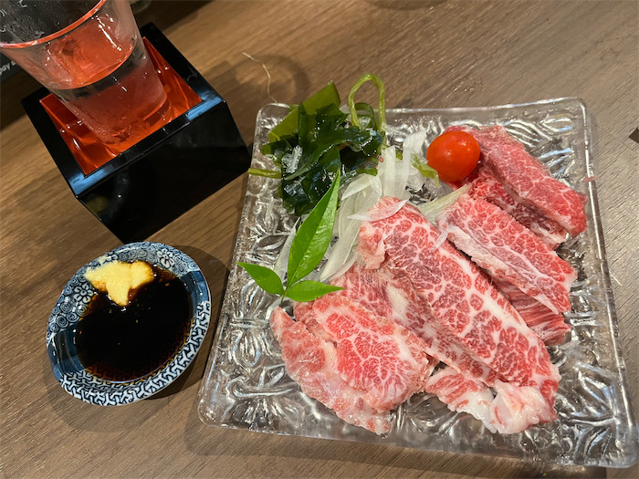 ◆夕餉は道後温泉の家庭料理〈道後むすび・かぐわ〉にて。北海道直送の白アスパラガスととうもろこし、そして馬刺しが登場した。