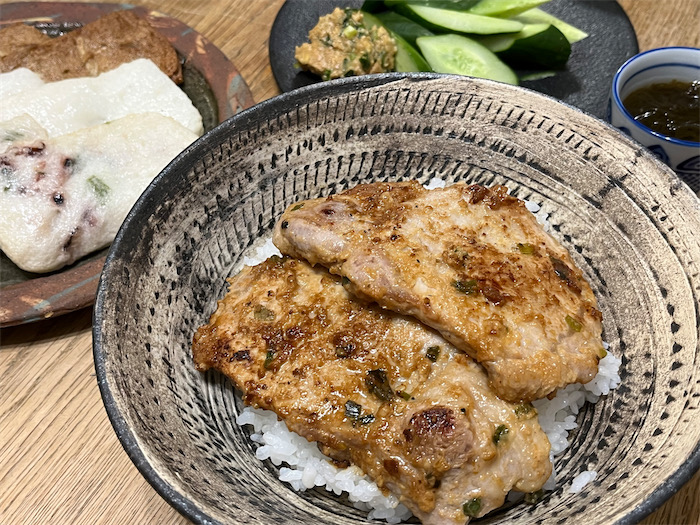 ◆雨夜。今宵の〈みなか食堂・つくば本店〉のメニューはシンプルかつ強力な「豚丼」。豚肉の下味は葱味噌&酒粕でつけている。道後店では連日お魚ばっかりだったが、豚肉の本場であるつくばに帰ってくるととたんにこういう “お肉メニュー” になる。