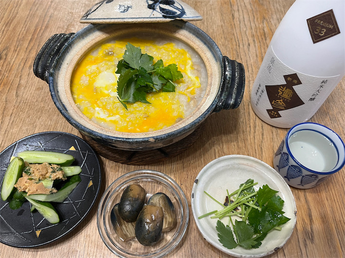 ◆雨夜。〈みなか食堂・つくば本店〉の夕餉は、稚内直送のホタテを使って昨夜炊いた「土鍋ホタテ飯」を雑炊に仕立てた。連日のホタテづくし。 “お水” は、いただきものの新潟・弥彦酒造の純米大吟醸「泉流 彌彦 PREMIUM 33」を抜栓。