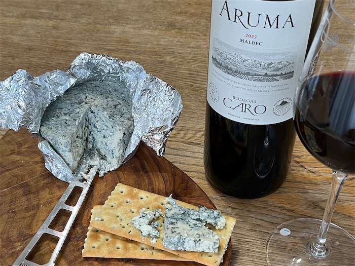 デザートとして、札幌の「北海道小林牧場物語」のブルーチーズとともに、アルゼンチンの「Bodegas Caro Aruma Malbec 2022」を抜栓。