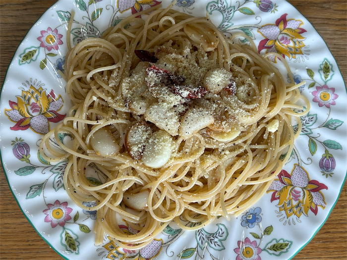 ◆再開した〈みなか食堂・つくば本店〉のランチメニューは大蒜かなり多めの「アーリオ・オーリオ・ペペロンチーノ」と「フルーツサラダ」。