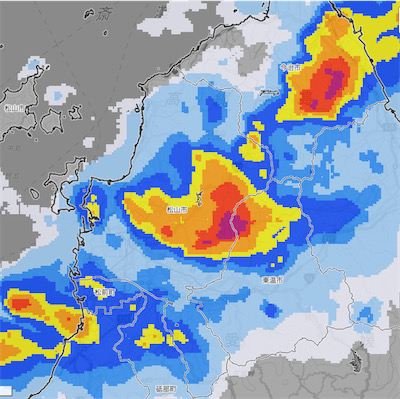 ◆午前7時前、雷が轟く温泉街。アメダスを見ると兇悪な雨雲が西から接近している。本降りにならないうちにコインランドリーへ急いだが、帰り道はいきなりの土砂降りでもうタイヘンなことに。