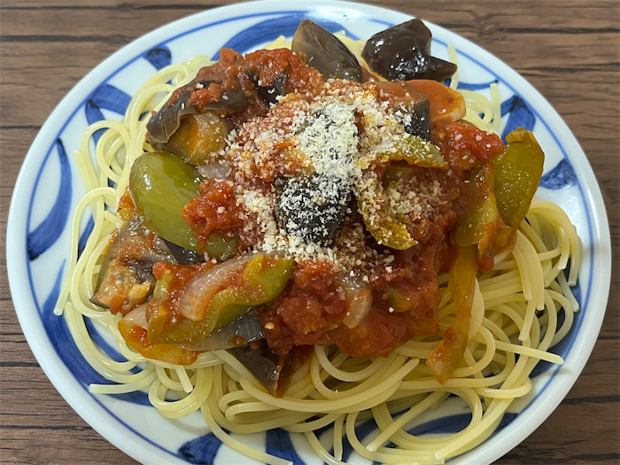 ◆道後樋又の大学圃場では夏野菜の収穫が今も続いている。今日も事務室前で茄子が配られていたので遠慮なくいただいてきた。前に収穫されたピーマンがまだ冷蔵庫の野菜室に残っていたので、今宵の〈みなか食堂・道後店〉の夜メニューは「残暑の夏野菜トマトソースパスタ」。今回は、カットトマト缶を使ったのでかなり濃厚な味になった。余った夏野菜トマトソースは三温糖とバルサミコ酢と白ワインをちょいと混ぜて煮詰め、粗熱が取れてから冷やせば「夏野菜のカポナータ」になる。それは明日のお楽しみ。