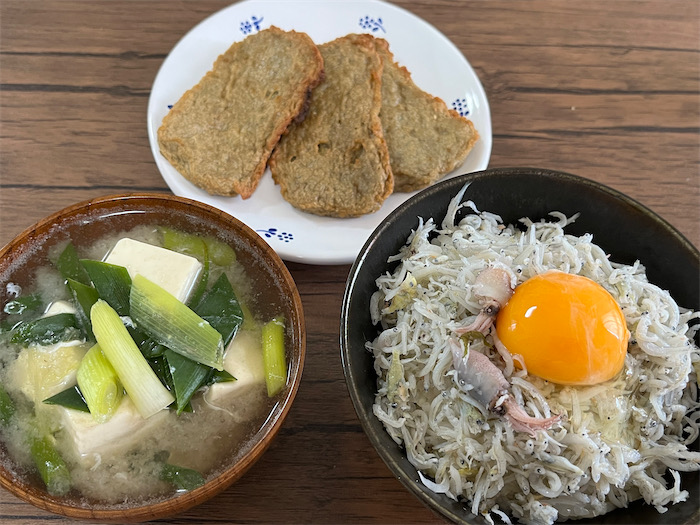 ◆〈みなか食堂・道後店〉の厨房から朝昼兼用の「愛媛一色ごはんセット」が運ばれてきた。メインは釜揚げしらす丼(卵黄トッピング)、副菜はじゃこ天。今日の釜揚げしらすには大きなイカの仔が潜んでいた。汁物は昆布と削り節の合わせ出汁をベースにして、青ねぎと絹ごしのお味噌汁。もちろん宇和島・井伊商店の麦味噌で。松山揚げを切らしたのは痛恨のミスだった。