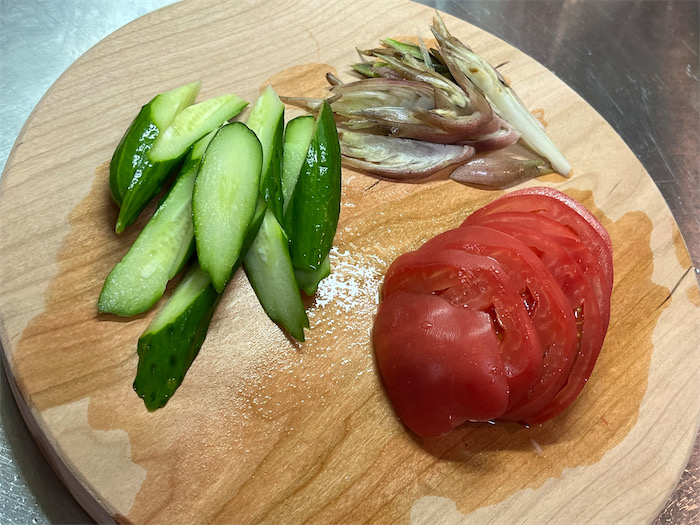 ◆今日の┣┣" 撃ちを終え、夕方、道後公園横の〈BRIDGE〉に初入店し、前から狙っていた “まん丸まな板” をゲットした。〈みなか食堂・道後店〉厨房で日常的に使っている “お魚まな板” はオリーブの古木から切り出した一枚板だが、それとは別の “野菜まな板” が欲しくなった。買ってきたのはブラックチェリーの一枚板。厚さ3cmで、直径30cmサイズのまん丸。さっそく前菜の野菜を切ってみた。よしよし。