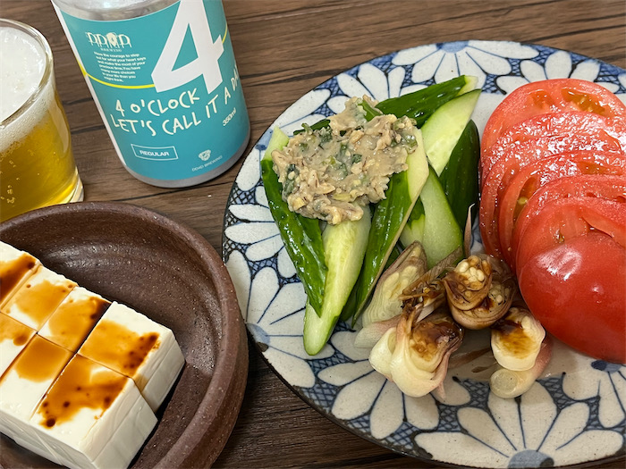◆大学でうだうだ淀むことなく即撤収。人だらけの道後温泉街を回避しながら帰宅。〈DD4D Brewing〉の河内晩柑 Brut IPA「4 o'Clock Let's Call It a Day」を抜栓。前菜はいつもどおり。朝は貧乏人のスパゲティ、昼は大学で支給されたサンドイッチだったので、夜は白米を炊いた。