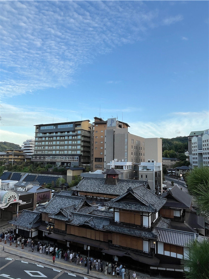 ◆朝イチの〈飛鳥乃湯泉〉に飛び込んでから、数ヶ月ぶりに冠山の石段を上がって足湯へ。見下ろす道後温泉本館は長蛇の列。空が高くなった。