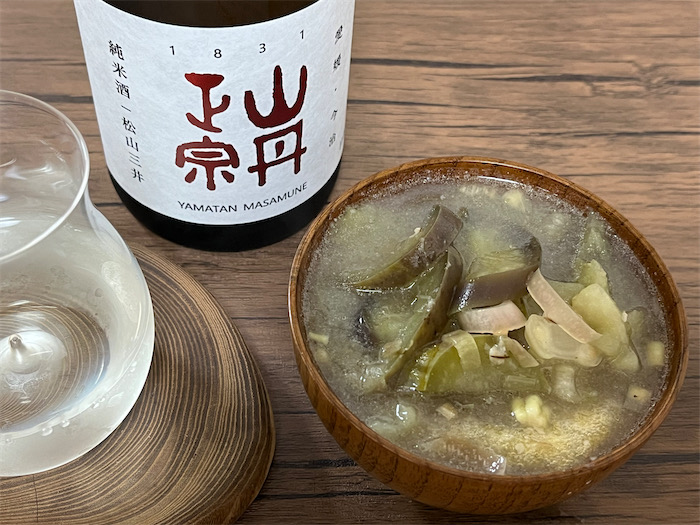 というわけで、今宵の〈みなか食堂・道後店〉では「秋茄子とミョウガと松山揚げのお味噌汁」を。だし昆布と削り節の合わせ出汁に半月切りにした秋茄子を投入。火が通ったら松山揚げを割り入れて、宇和島・井伊商店の麦味噌をやや濃い目に溶き入れる。火を止めてから輪切りにしたミョウガを投入してそのまま蒸らせばできあがり。