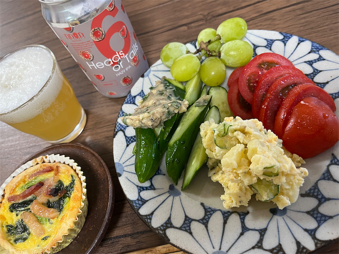 今宵の〈みなか食堂・道後店〉の前菜はデラックス。いつものきゅうりの葱味噌トッピング、ミディトマトのスライス、自家製ポテトサラダの残り、さらに伊台産のシャインマスカットと〈ユノマチベーカリー〉のキッシュが付いてきた。 “お水” は〈DD4D Brewing〉のHazy IPA「Heads or Tails」。