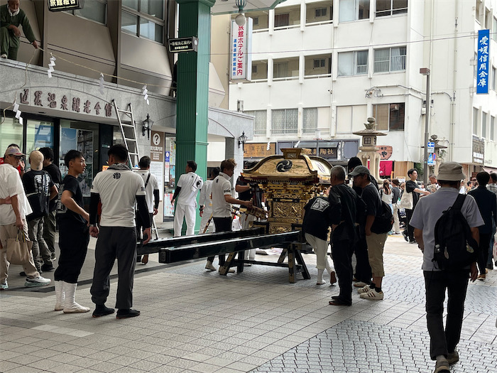 ◆午前中はゆるゆる過ごし、午後は大街道へ買い出しに。道後温泉に戻ってきたら、駅前は神輿を囲んで酒盛りの真っ最中だった。買ってきた1.5Lのプラ容器で「昆布&いりこ出汁」をつくって冷蔵庫へ。これでお味噌汁や煮物の調理がラクになる。
