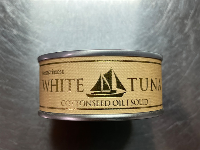◆静岡の清水にある〈オーシャンプリンセス〉の上等なびん長まぐろ(ホワイトツナ)の「綿実油ソリッド」缶をお土産にいただいた。見るからに高そうなツナ缶。
