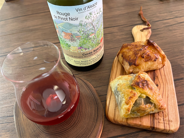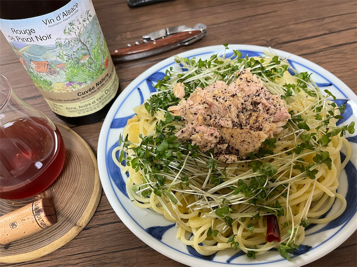 今宵の〈みなか食堂・道後店〉の夜メニューは即決でキマり。アーリオ・オーリオ・エ・ペペロンチーノにブロッコリーのスプラウトを散らして、綿実油ごとドーンとまぐろをトッピング、最後に岩塩と黒胡椒を振った。この上なく美味。確かにこれをいただいたら、ほかのツナ缶はもう食べられないだろう。どうもありがとうございました。このびん長まぐろのパスタにどんな飲みものが合うか自分会議はしばし紛糾したのだが、多数決によりアルザスのドメーヌ・デュルマン(Domaine Durrmann)の赤ワイン(Pinot Noirの無濾過ナチュラルワイン)を抜栓した。