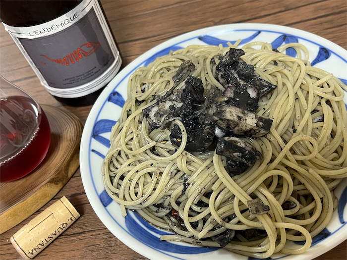 今日、ある学生が「イカ墨スパゲティをつくりました」と写真を見せてくれたので、よし!ということで、〈みなか食堂・道後店〉の夜メニューは「コウイカのイカ墨スパゲティ」となった。見た目は白っぽいが、お皿の底は真っ黒。墨袋をいじった指先も真っ黒。たくさん食べた唇も真っ黒。イカ墨パスタの宿命。