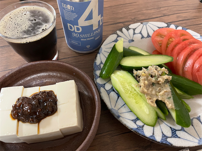 ◆残暑の〈みなか食堂・道後店〉の前菜はよくも悪くもワンパターンで、葱味噌を乗せたきゅうり、岩塩を振ったトマト、そして同僚の中島琢自先生がつくった醤【ひしお】をトッピングした絹ごし豆腐が連日登場する。きゅうり一本、トマト一個、豆腐半丁は松山的には「鯛一尾」に相当する値段。最高気温35.7度の猛暑日だったので、“お水” は強めの〈DD4D Brewing〉の Wee Heavy「90 Shilling」を。