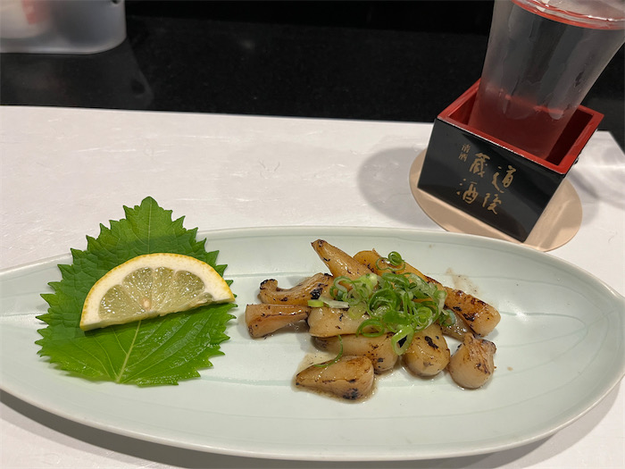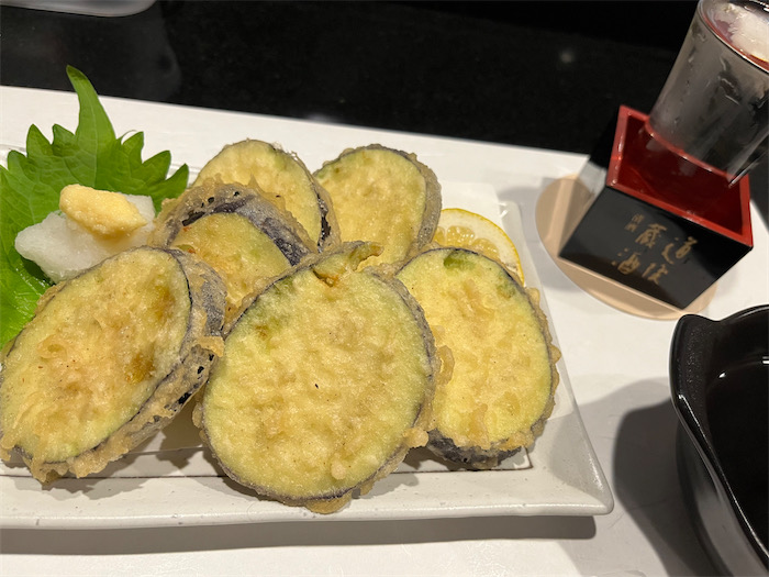 ◆しかし、帰り着いた部屋が室温35度でいられなかったので、近くの酒処〈はる〉に即座に避暑。松山産の長茄子の天麩羅と宇和島の真珠貝バター焼き。 “お水” は〈城川郷〉特別純米「尾根超えて」と〈石鎚〉の純米吟醸。