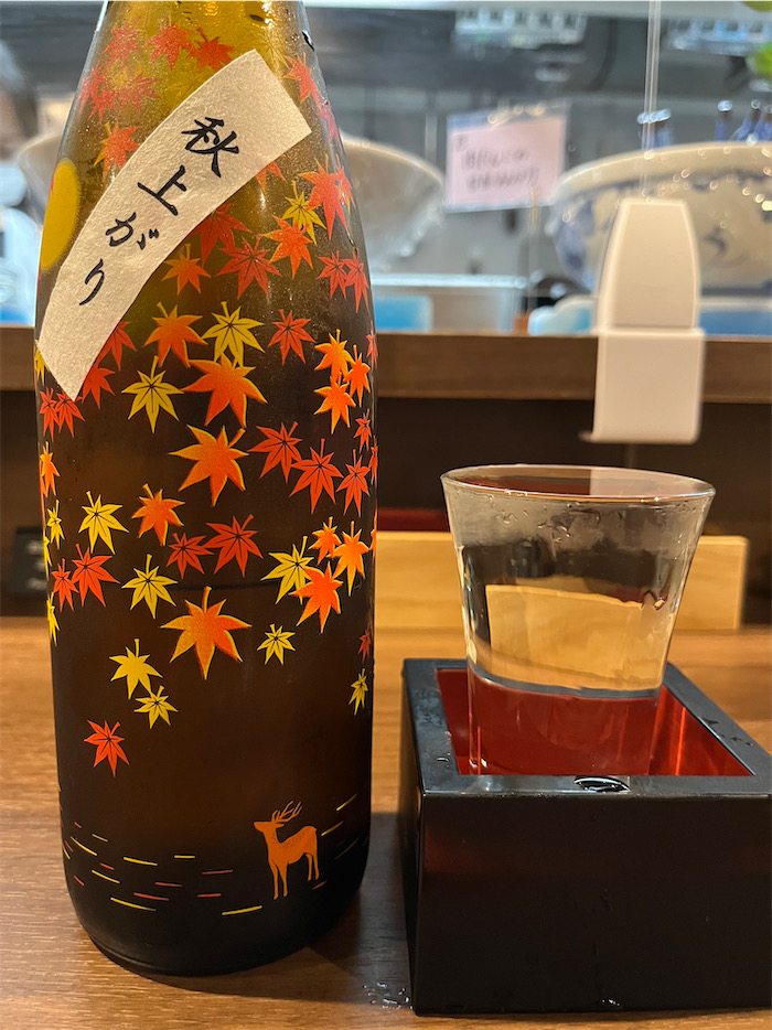 ◆今日は晴れたり曇ったり降ったりという落ち着かない空模様だった。最高気温は27.3度。湿度が高く蒸し暑い一日だったので、今宵は〈むすび かぐわ〉にて、四日市・石川酒造の〈噴井【ふきい】〉純米もみじボトル「秋上がり」を。ひやおろしも秋上がりも今の季節ならでは。