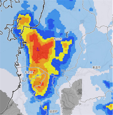 ◆曇り空の正午の気温は29.0度。南からはいかにも兇悪そうな雨雲が松山城下に接近している。午後は雨になるとの予報。遠雷も聞こえてきた。