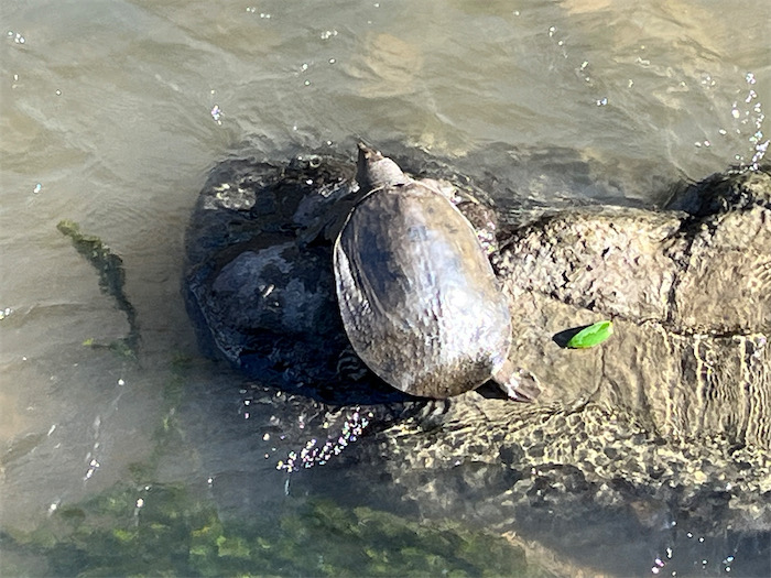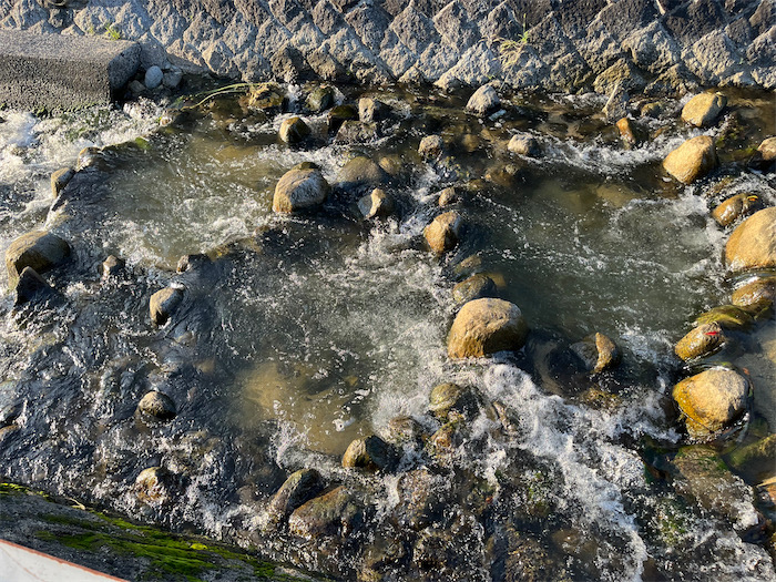 ◆夕暮れの隠し撮り —— 夕方、水域サークルが護國神社前の川で清掃作業していたので同行した。前日の雨のせいで、水量がかなり多くなっていて、長靴ではなく胴長が必要だったようだ。カワムツがいたるところに群れているこんな川が、大学キャンパスのすぐ裏手に流れているというのはちょっとビックリかも。