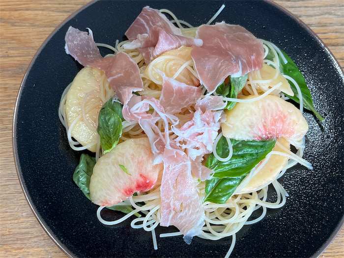 ◆午後の最高気温は35.6度。焼けつく日差しと押し寄せる暑さ。九月に入ってもこんな猛暑日が続くのはたまらんなあ。せめてランチくらいさわやかに。冷たく冷やしたカペッリーニに、白桃とバジルの葉、そして生ハムをトッピング。