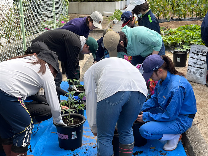 ◆午後の┣┣" 撃ち —— 「農業基礎演習 II」初回講義では、大学圃場で、中玉トマト苗の定植作業とイチゴ苗の定植前準備。最後に、秋ナスを収穫した。脇の畑ではさつまいもがはてしなく蔓を伸ばしているが、はたして地下部はどうなっているのだろうか?