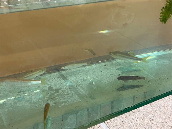 ◆午前の┣┣" 撃ち —— 大学の旧棟にある動物実験室の片隅に人知れず置かれたアクアリウムが本格始動し始めたというので見に行った。水槽に今いる魚はカワムツとオイカワ、そしてヨシノボリ。水草にはミズカマキリもついている。世話をしている学生の話ではこれからまだ増やすらしい。
