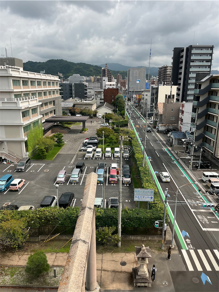 ◆「海洋と水産の科学」10:50〜12:20 オンライン講義のサポートが終了して昼休み。正午の気温は28.5度。新棟5階の中講義室から護国神社の鳥居を見下ろし、遠く道後温泉を望む。雲が多くて蒸し暑そう。