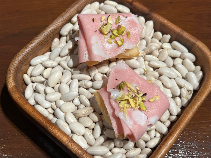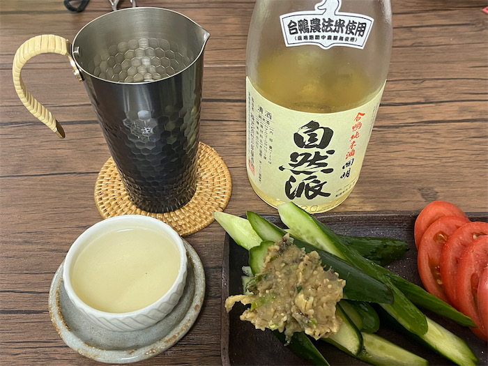 “お水” は東北で揃えた。秋田〈天の戸〉の無濾過純米酒「美稲80」。80%精米でほのかに色づいている。燗酒でお出しします。一升で2,200円はフトコロにやさしすぎる。もう一本は山形〈麓井〉生酛純米ひやおろし生詰原酒。こちらは冷酒でどうぞ。