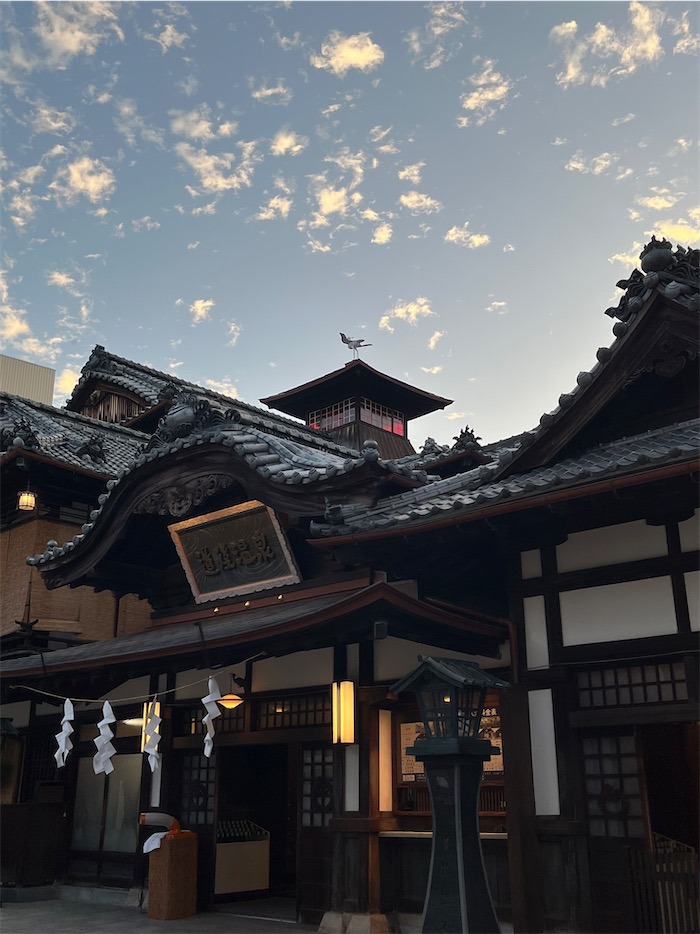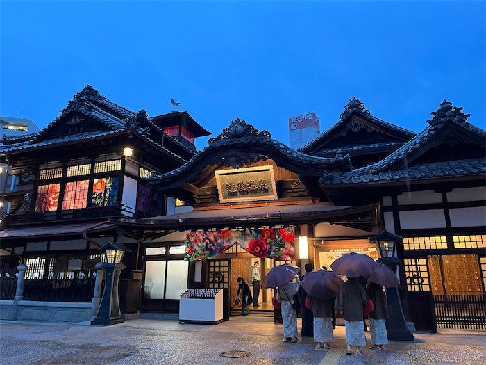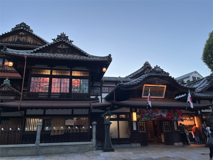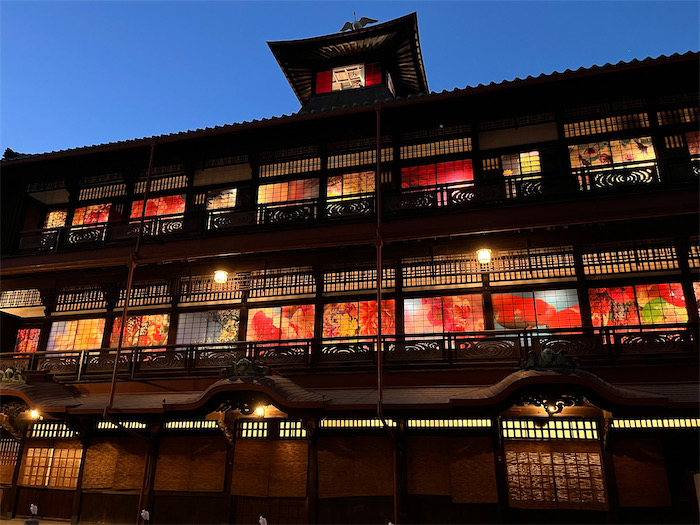 ◆今朝は秋晴れ。最低気温は12.5度と昨日よりもさらに寒くなっている。夜明け前の道後温泉本館。最上階の振鷺閣から朝の刻太鼓が鳴り響いた。本館のデコレーションはいま開催中の〈蜷川実花 with EiM × 道後温泉 DOGO ART〉による。入湯客の長蛇の列を横目に〈みなか食堂〉店主は別館〈飛鳥乃湯泉〉を独り占め。