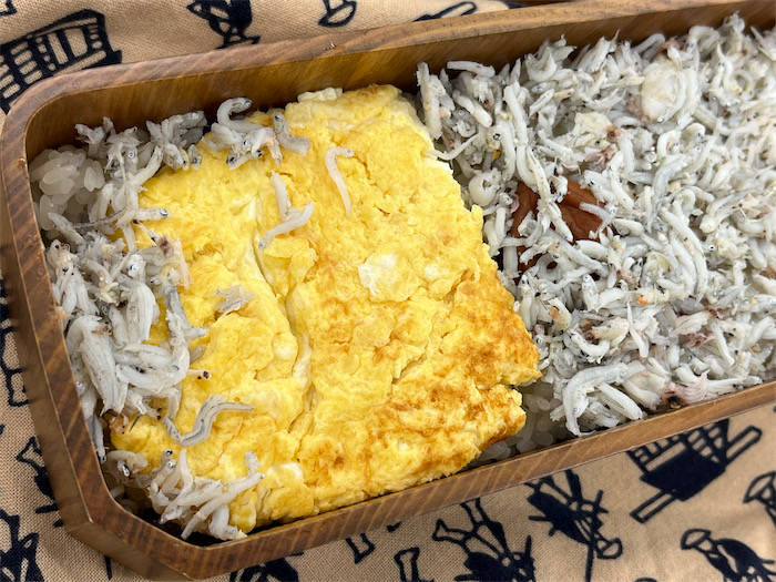 ◆本日の勇気の出るお弁当は “いちめんのなのはな” ならぬ “いちめんのしらす” 。 釜揚げしらすは生魚と同じくらい足が速いので、勢い込んで食べ続けるとたいてい賞味期限よりも前になくなってしまう。