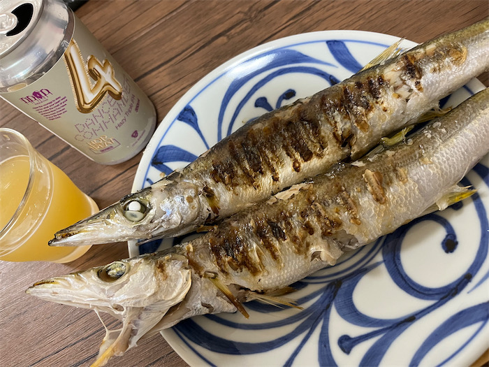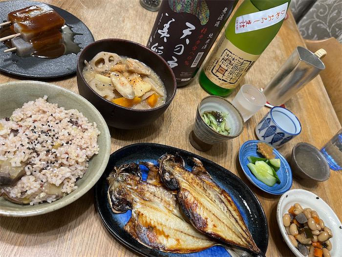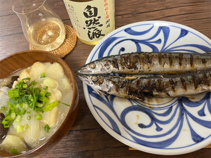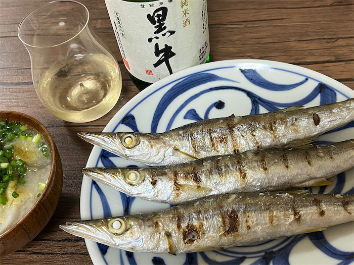 ◆カマスがまだ氷温室にたくさんいるので、今宵は奇をてらうことなく岩塩を振って、ロースターで塩焼きにした。土鍋で炊いた白米と、里芋・秋茄子・松山揚げの麦味噌汁、“お水” はめずらしく和歌山・海南の〈黒牛〉純米酒を抜栓。